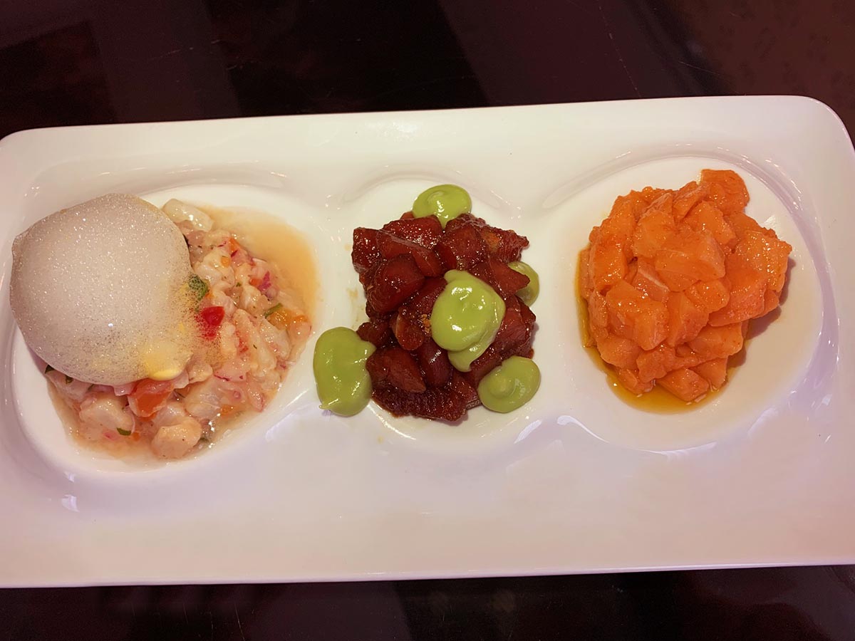 Trio de Crudos, compuesto de ceviche de pescado, tartar de atún y tartar de salmón
