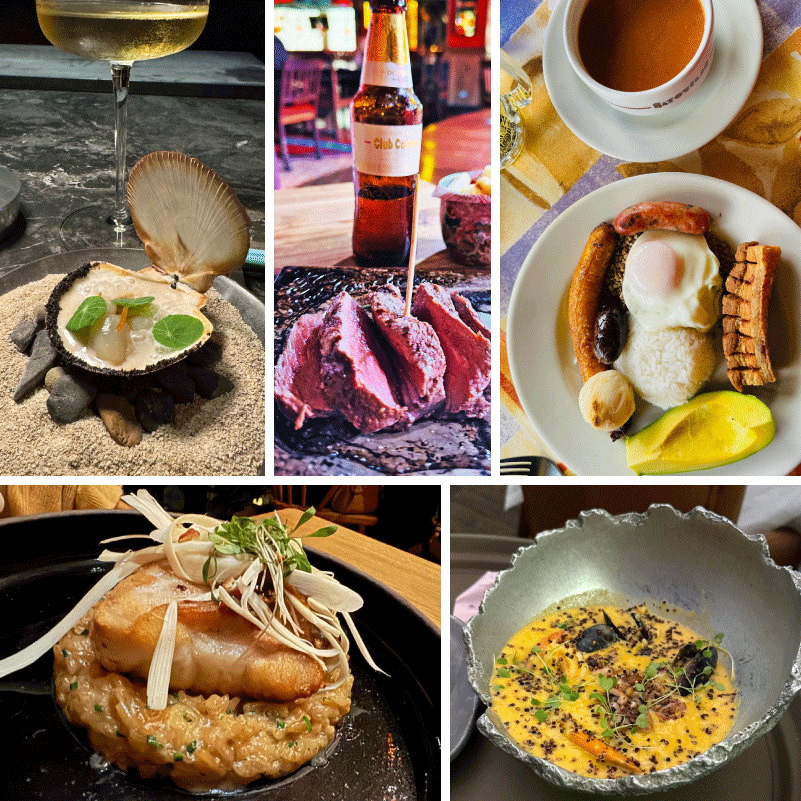 Colosal es otro de los restaurantes a visitar.  Goza de una espectacular vista de la ciudad por su ubicación en la falda de las montañas que rodean a Medellín y una cocina contemporánea y de autor.  Una de las delicias para comenzar es el Carpaccio de Pulpo, con leche de tigre, aceite de oliva y cilantro, hojas verdes orgánicas y queso Grana Padano.  También les recomiendo el Arroz Caldoso de Mariscos y Pulpo, con mariscos de temporada, curry rojo, bisque de langostinos, pulpo a la parrilla.  Muy sabroso.  Aquí la cava de vinos es extraordinaria, el servicio muy amable y eficiente.  Están ubicados en Cl. 16a Sur #9F-13, Casaloma, Medellín, Santa Elena, Medellín, Antioquia. Tel. +57 316 5564641