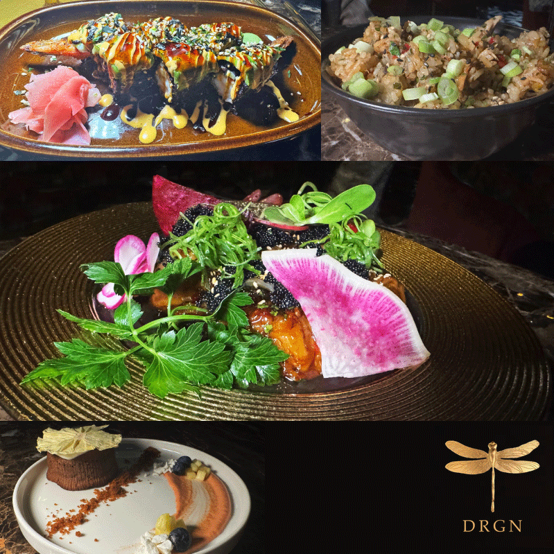 Su nueva propuesta culinaria DRGN, brinda las influencias latinas y asiáticas juntas de una manera diferente y creativa. Los visitamos para reseñarlos y comenzamos con el DRGN Roll, un rollo con camarones en tempura, arroz prohibido (forbidden rice), aguacate y crema de cebollinos. Estaba delicioso, muy diferente y con una combinación de sabores y texturas que impresionan al paladar, lo recomiendo. Después seguimos con los Guisado Pork Dumplings, con plátano maduro con trufas, y un guiso sabroso que da un kick buenísimo. Lo siguiente fue el Duck Fried Rice, con pato guisado, cebollinos, recao y plátano maduro. Este plato es un clásico del Chef Treviño, siempre lo pedíamos en sus otros restaurantes, no obstante encontré esta versión muy diferente, no lo que yo esperaba.