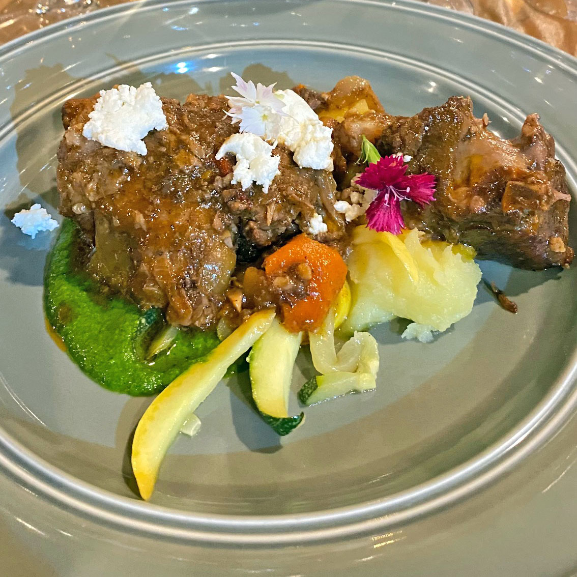 El Fricasé de Cordero fue el tercer curso, presentado sobre un puré liviano de berros y albahaca.  Lo acompañaron de batata hervida, calabacín y pedazos de queso de cabra simplemente rotos y tirados encima.  Lo encontré delicioso y el maridaje fue con Silver Ghost, Cabernet Sauvignon, Napa Valley, CA.  Perfecta combinación.