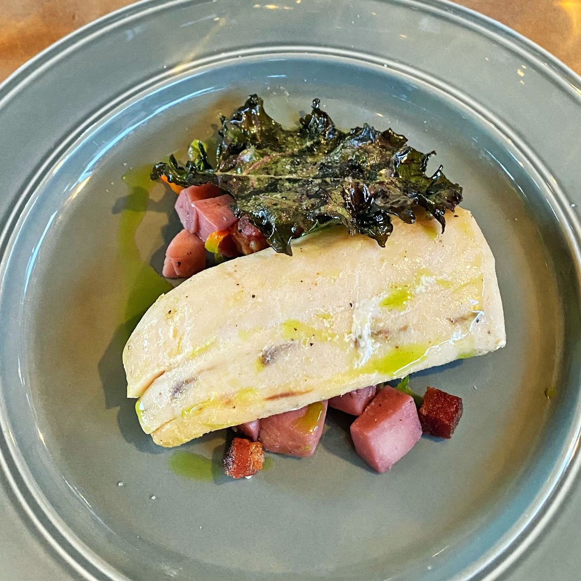 El segundo curso fue el Filete de Mahi-Mahi pochado en aceite de recao.  Acompañado de yautía y ajíes encurtidos, junto con dados de cerdo ahumado y coronado con una hoja de col rizada (kale) frita. El pescado muy fresco y hecho a buen punto, la combinación de sbores muy diferente.  Lo acompañamos con un Joseph Drouhin, Chablis Vaudon, Borgoña, Francia, que estuvo perfecto.
