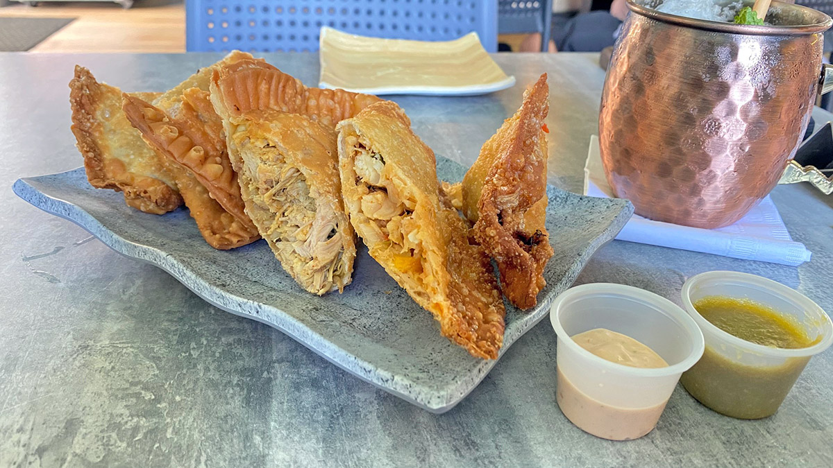 Seguimos después con un Trío de Pastelillos, de berenjena y quínoa, de pollo, y de bacalao.  Cual de los tres más rico, abundantes en relleno, la masa liviana y bien fritos, sin exceso de grasa.  Me recordaron los hechos en casa.