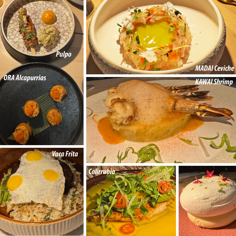 Los visitamos para reseñarlos y comenzamos con los aperitivos.  Lo primero fue el MADAI Ceviche hecho con Dorada japonesa, con leche de tigre de guanábanas y jalea de ají dulce. Estuvo espectacular, me gustó mucho.  Después el Pulpo, en pincho de parrilla, con cebolletas, chimichurri, pimentón, acompañados de guineítos en escabeche.  Seguido por las ORA Alcapurrias, montadas con tartar de salmón, coronadas con huevas de trucha ahumada.  Estaban buenísimas.  Otro aperitivo fe los Muslitos de pollo frito, adobados, acompañados de repollo con mayo y mostaza karashi japonesa, muy sabrosos.