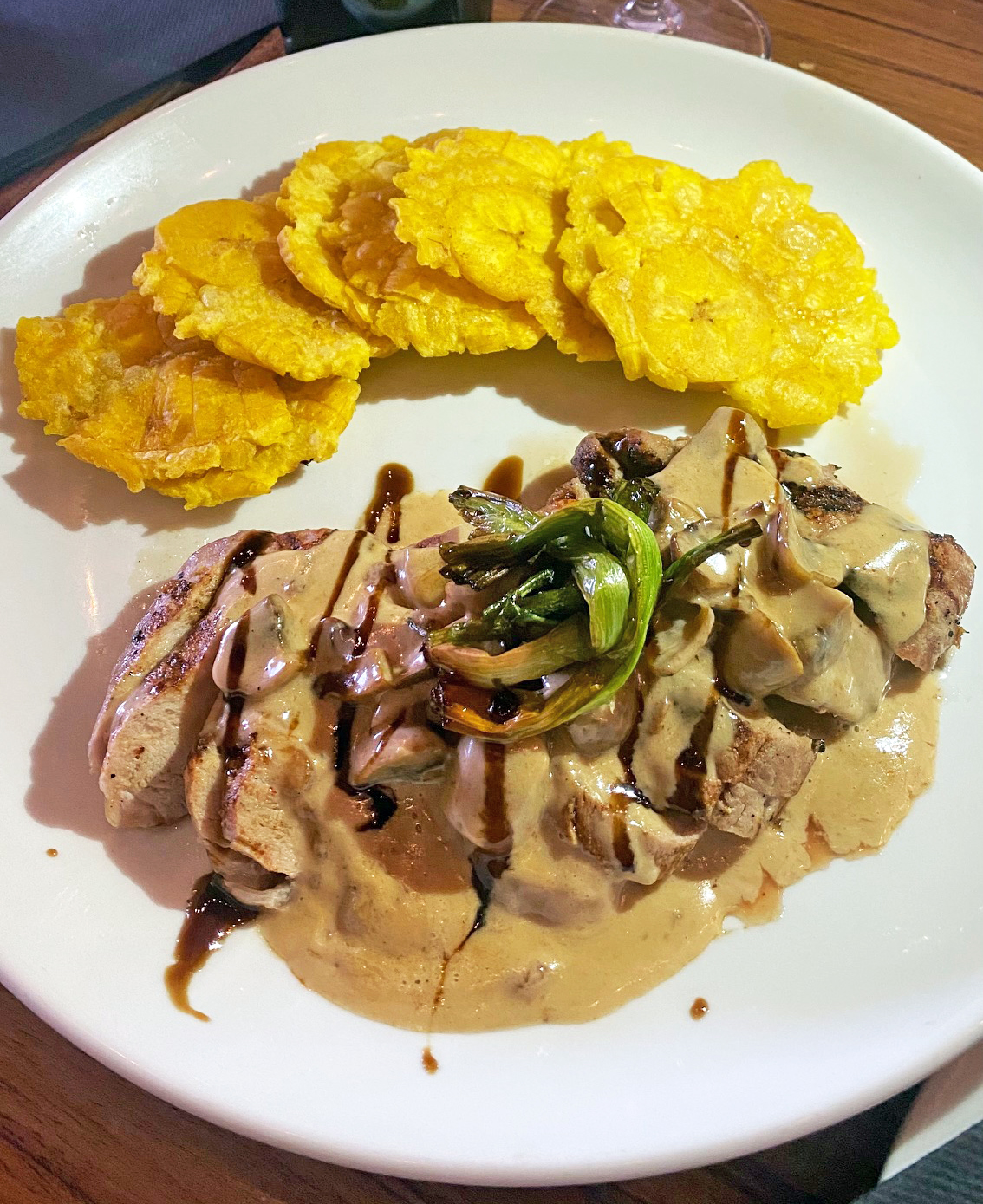 El siguiente curso fue el Ribeye de Cerdo, cocido en un demi-glace de setas, hecho a punto perfecto de cocción. Presentado con una guarnición de tostones de plátano estilo peseta y coronado con cebollinos verdes asados. Un toque de balsámico reducido lo terminaba por arriba. Me impresionó muchísimo, muy diferente, definitivamente lo pido de nuevo cuando regrese.