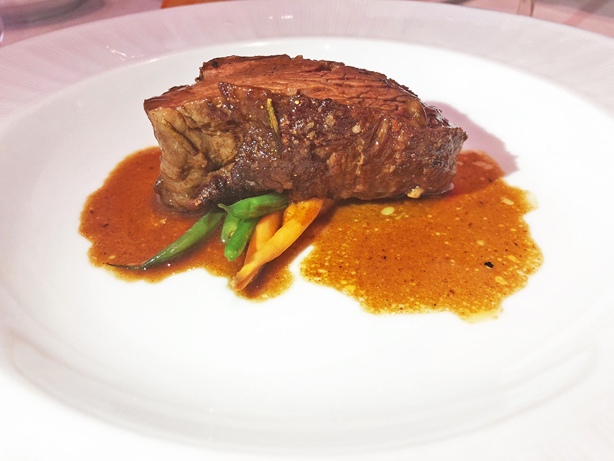 Filete de Res, hecho en su propio jugo y montado sobre habichuelas verdes y zanahorias al vapor