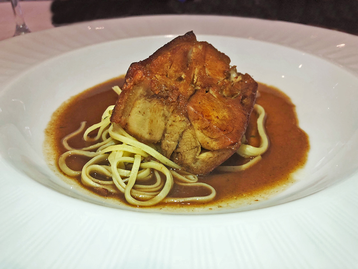 Pork Belly en reducción de vino Oporto sobre fideos