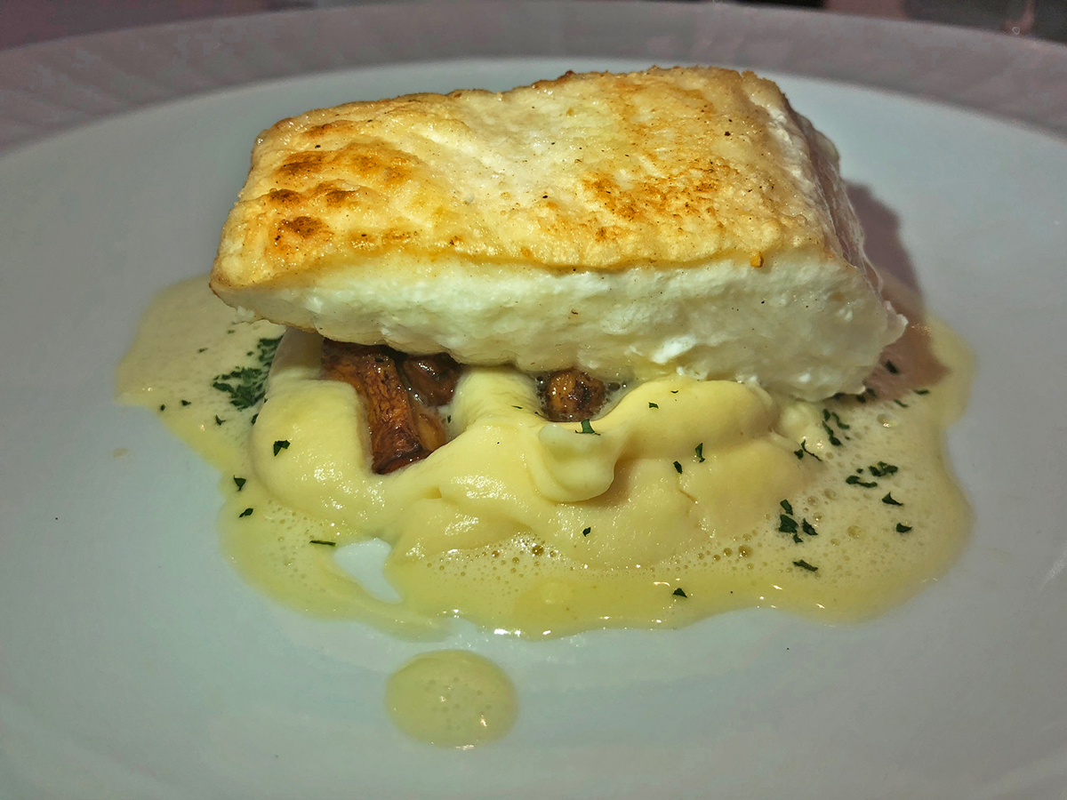 Rodaballo sellado y montado sobre un puré de nabo con beurre blanc de maíz y setas chanterelle